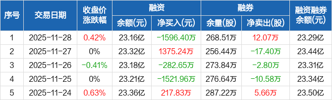 天风证券:融资净偿还1596.4万元,融资余额23.16亿元(11-28)