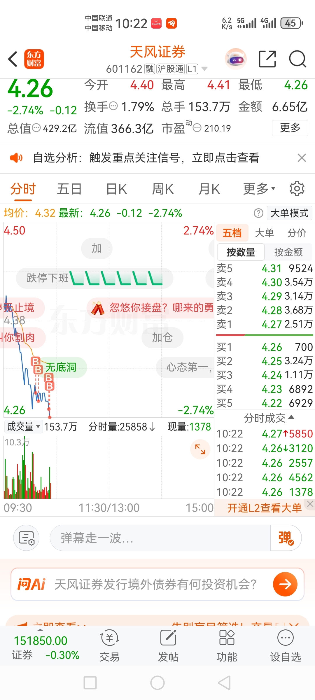 $天风证券(SH601162)$ 跌一分买100股,试试水