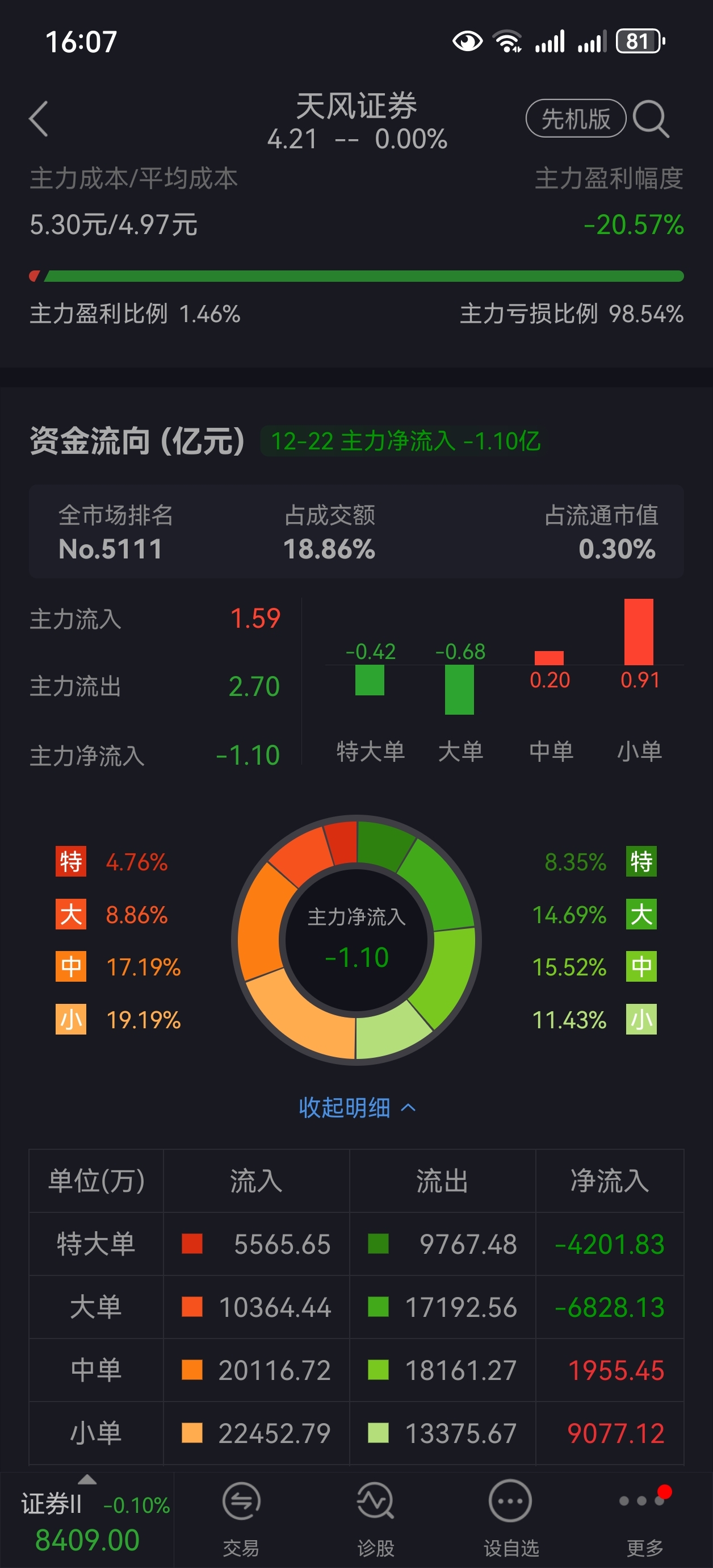 $天风证券(SH601162)$ 主力资金今日净流出1.1亿,你们还幻想往上涨呢?等跌到3块多时,我过来抄底。