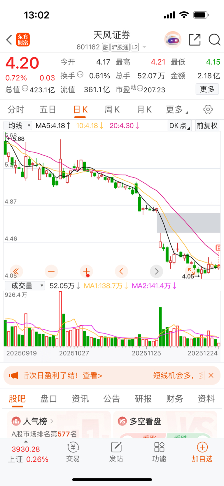 $天风证券(SH601162)$ 好像是企稳了,买几万块试试水