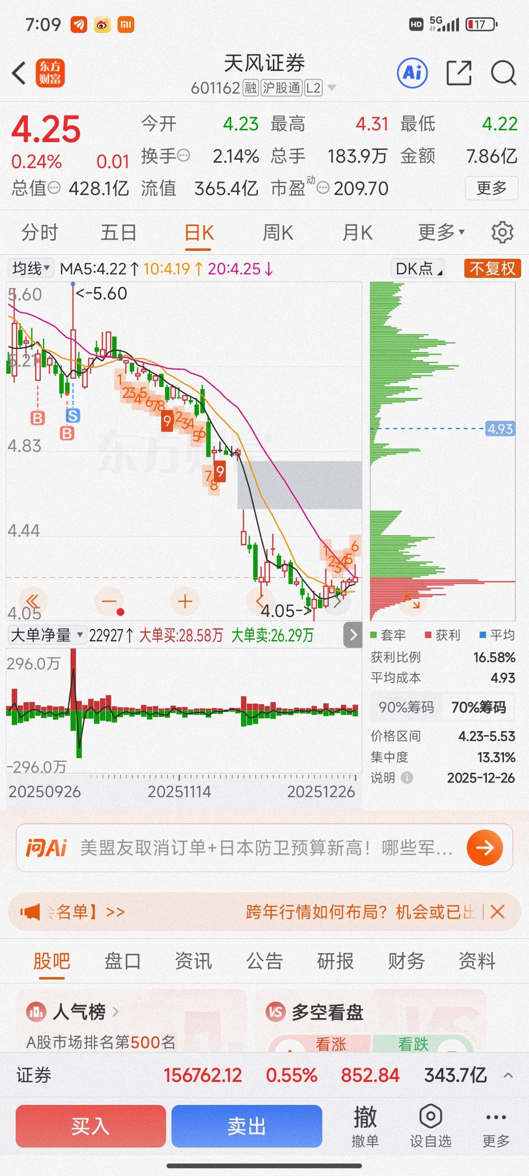 $天风证券(SH601162)$ 这走势真牛逼,证券带头砸,指数还能4000点左右想,现在看看证券真是虎口夺肉啊,但是我也没好哪里去,这个月负12%,凭运气赚的钱凭实力亏了,还在站岗