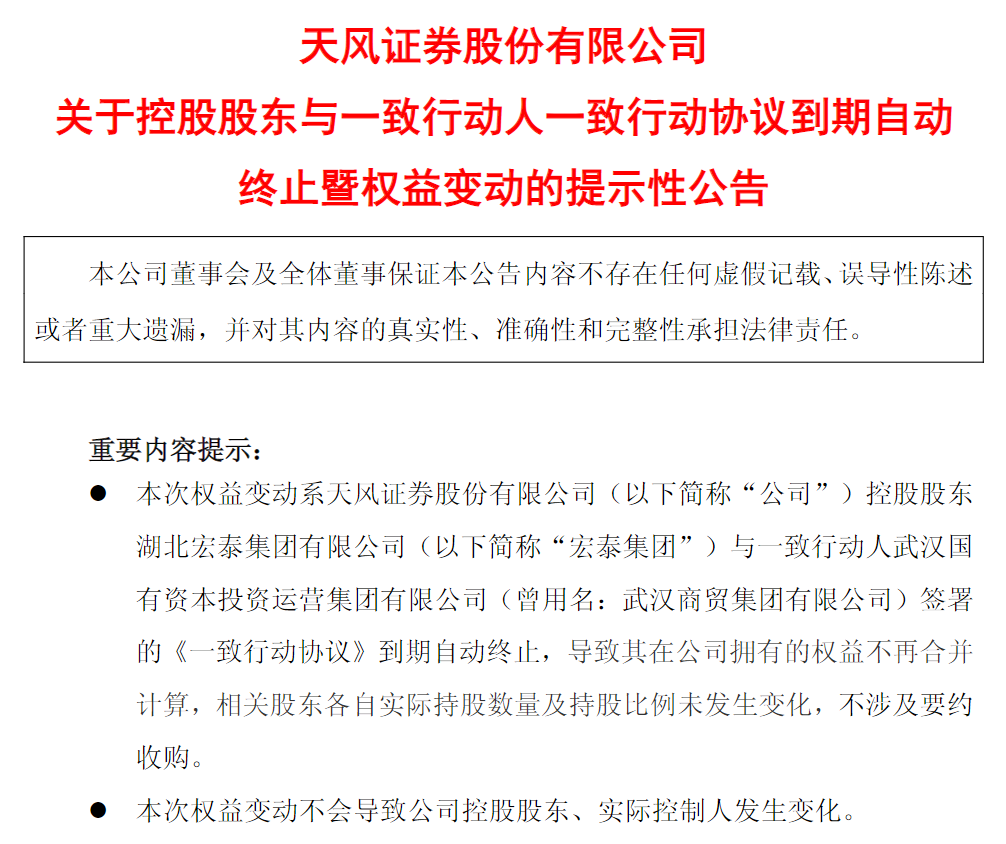 本次公告中,天风证券称,《一致行动协议》到期自动终止后,相关股东在公司拥有的权益不再合并计算,各方直接持有公司股份数量和持股比例均未发生变化。本次权益变动不会导致公司控股股东、实际控制人发生变化,亦不涉及要约收购。
