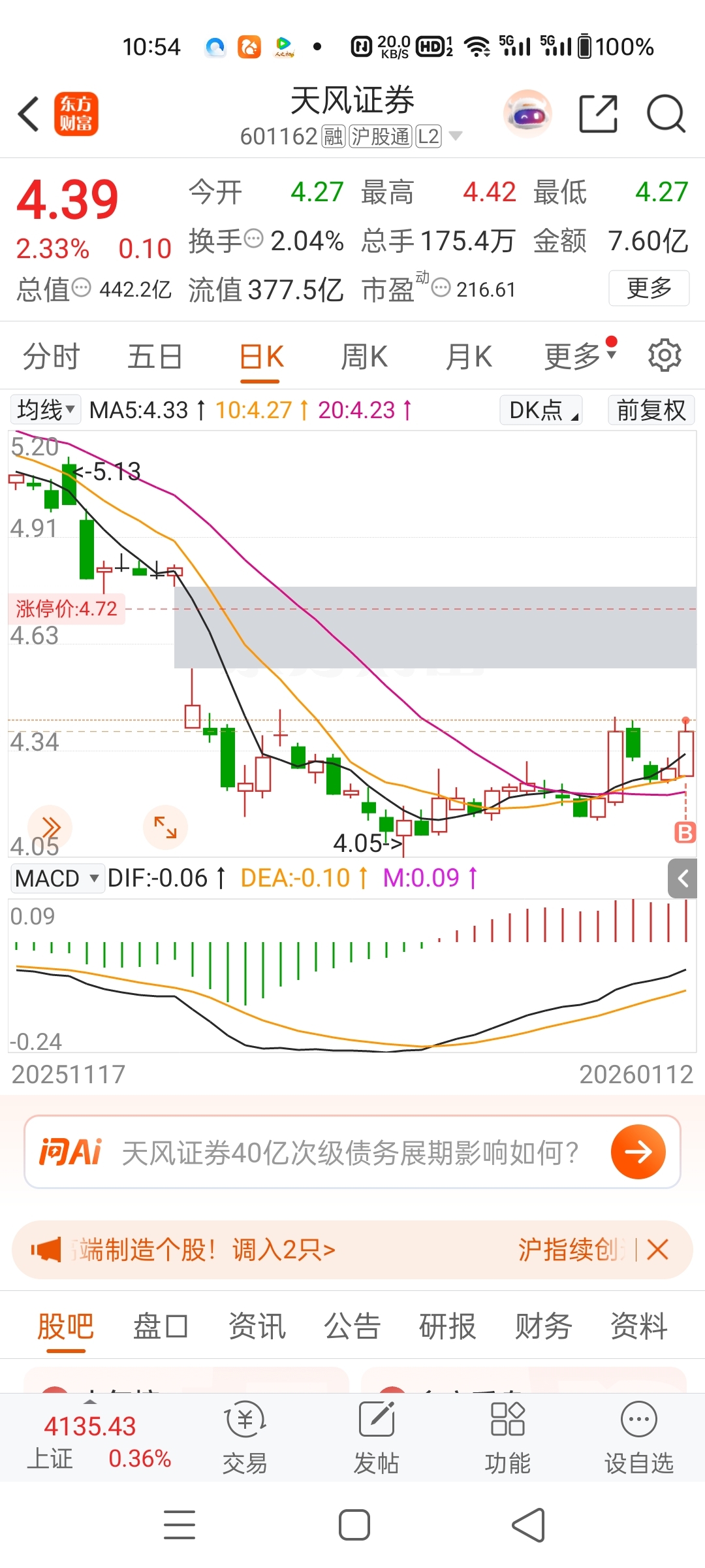 $天风证券(SH601162)$ 精准今天最高点,追高有我各位放心