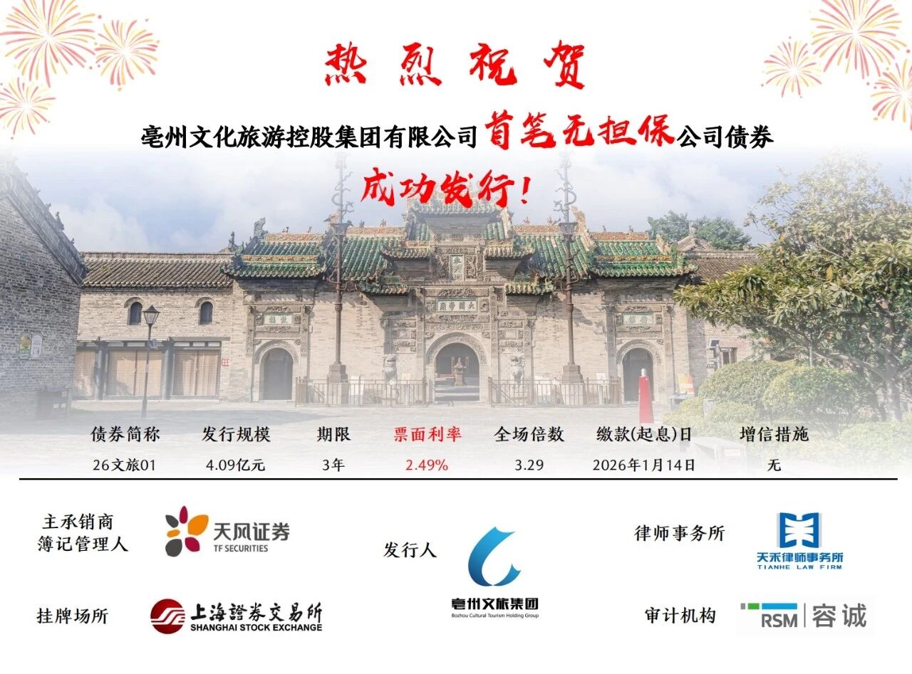 天风证券独家主承亳州文旅集团首笔无担保公司债券圆满发行
