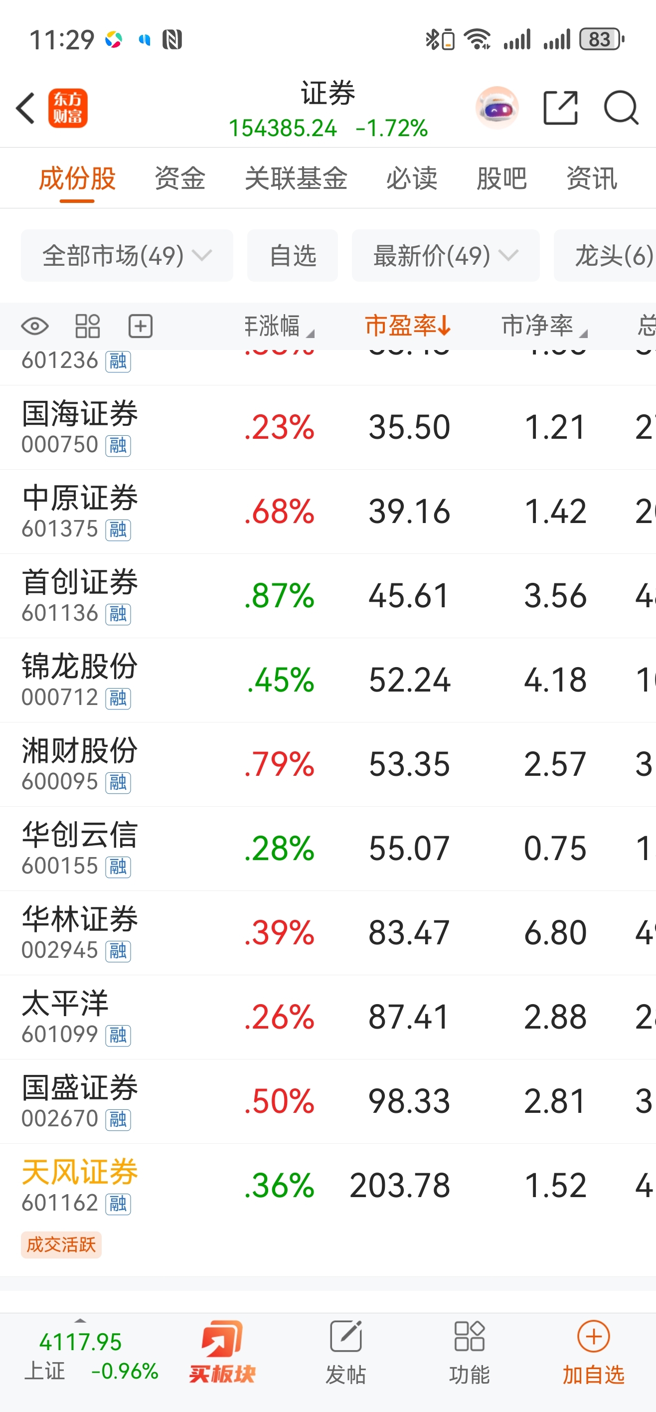 $天风证券(SH601162)$ 很多人问业绩好不好,你直接市盈率排个序不就知道什么水平了么?玩天风从来不看业绩,看业绩就不该来玩天风。如果你们非要看业绩炒股,那我天风玩的就是业绩最烂这个标签。
