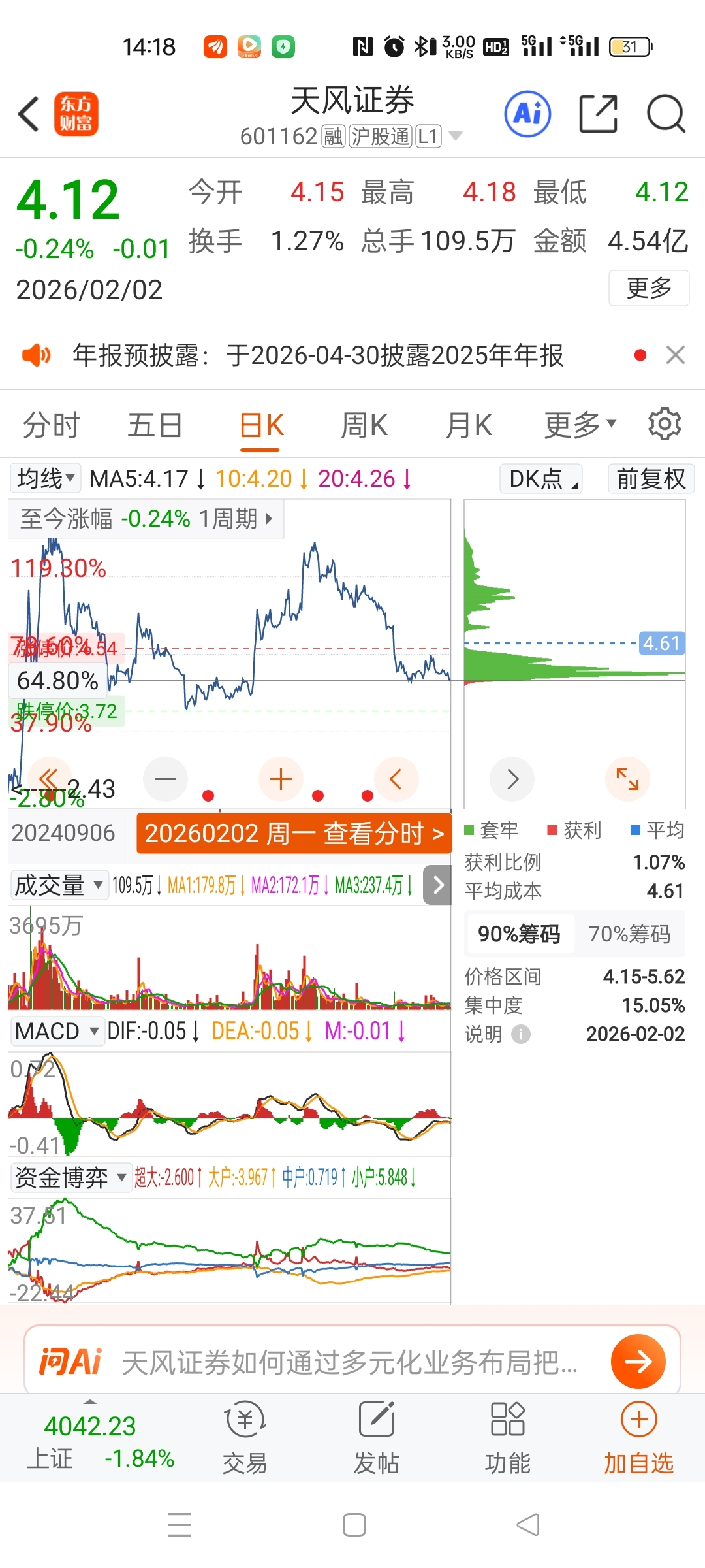 $天风证券(SH601162)$ 到达底部了吧??