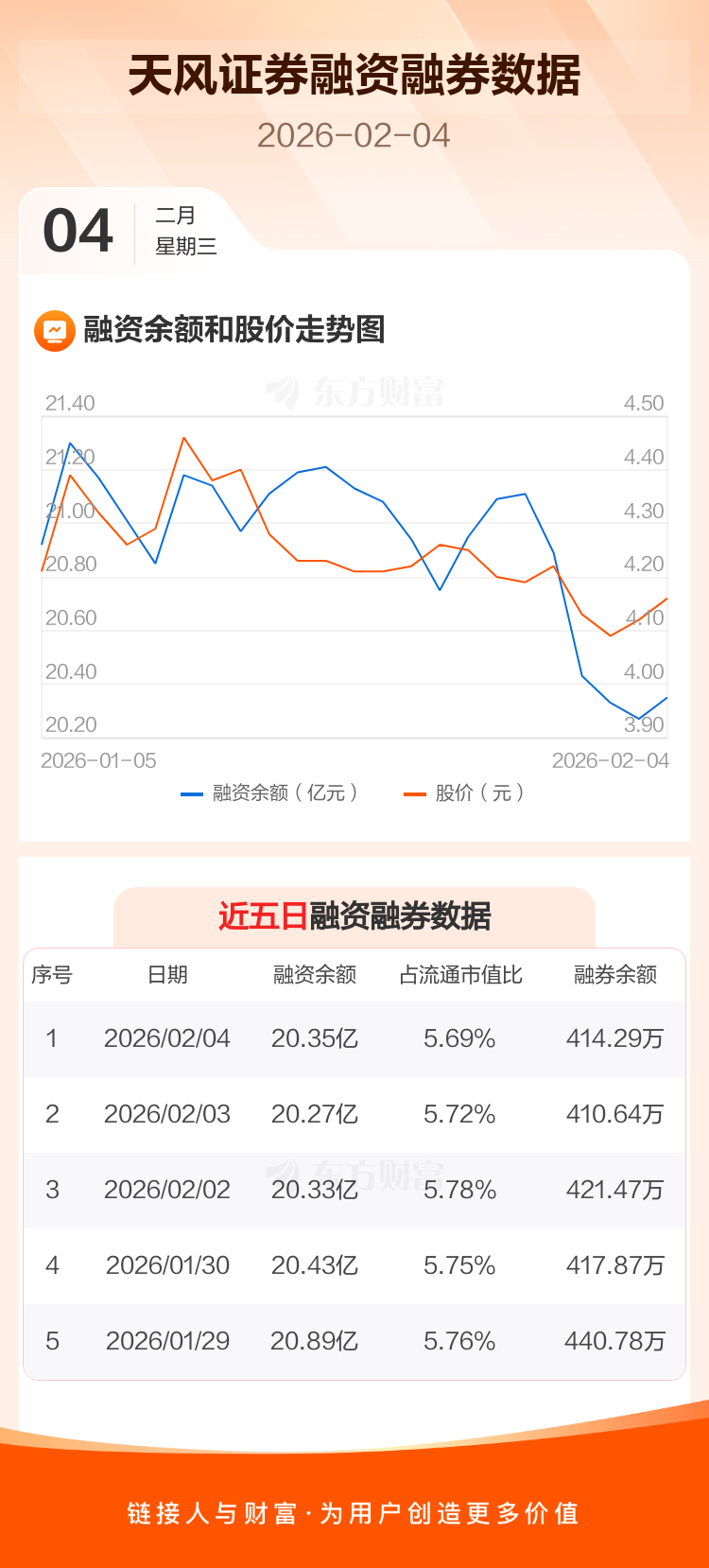 交易所最新数据显示,天风证券于2026年2月4日获融资买入5381.49万元,融资偿还4636.24万元,当日融资净买入745.25万元。目前,该股融资余额20.35亿,占流通市值比例为5.69%。