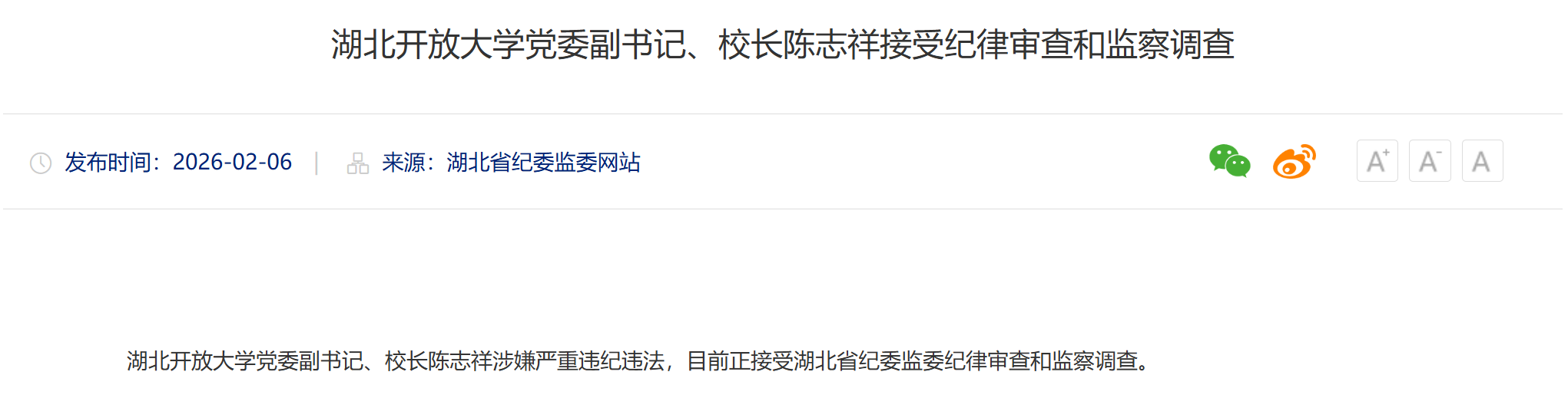 值得注意的是,陈志祥此次被查,距其调任湖北开放大学校长不足两年。