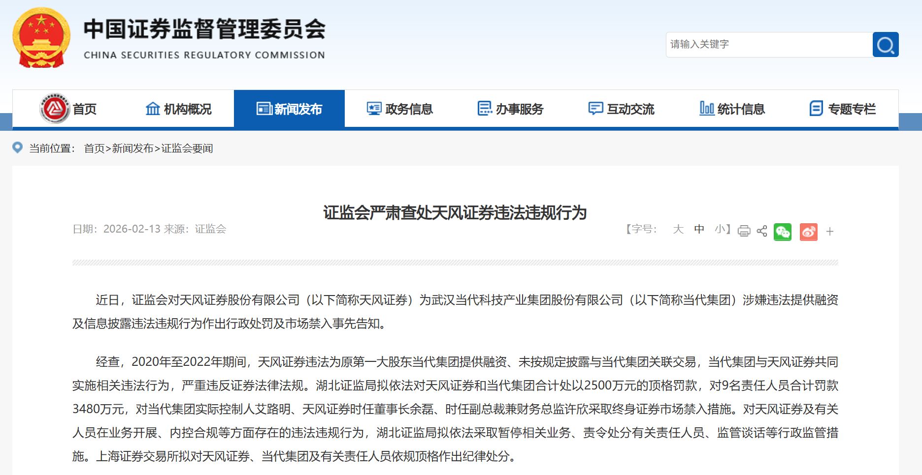 据证监会官网2月13日消息,近日,证监会对天风证券股份有限公司(以下简称天风证券)为武汉当代科技产业集团股份有限公司(以下简称当代集团)涉嫌违法提供融资及信息披露违法违规行为作出行政处罚及市场禁入事先告知。