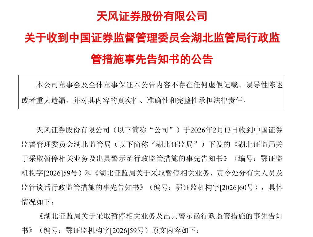 天风证券还公告称,公司及子公司天风天睿投资有限公司分别收到湖北证监局下发的事先告知书。天风天睿投资有限公司存在经营突破业务范围、管理的部分私募基金产品运作不规范等问题,拟被暂停新设私募基金产品1年及出具警示函。天风证券存在部分员工存在推介非公司代销的金融产品的情形、违规与武汉当代天信财富管理有限公司协同开展业务、违规销售福升安心稳健1号私募基金、经营决策不审慎等问题,拟被暂停开展代销私募金融产品业务2年、责令处分有关责任人员并报告结果、监管谈话。