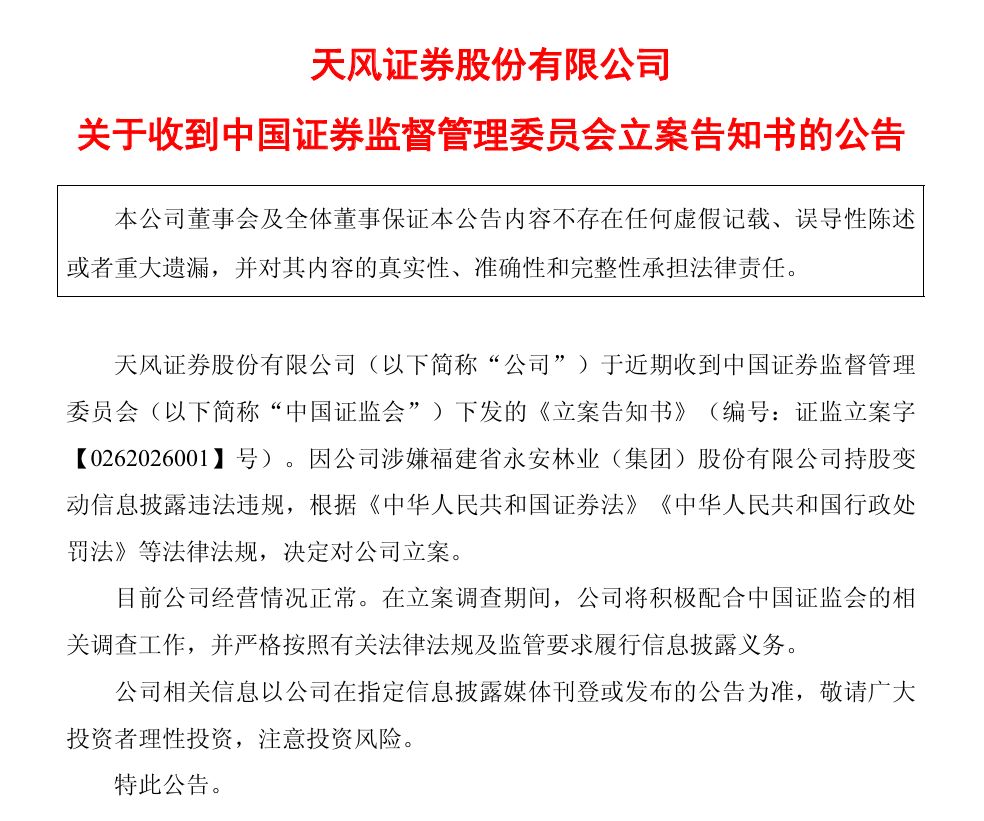 同日,天风证券(601162.SH,股价4.08元,市值411.02亿元)公告称,公司于近期收到中国证监会下发的《立案告知书》,因涉嫌福建省永安林业(集团)股份有限公司持股变动信息披露违法违规,根据相关法律法规,决定对公司立案。目前公司经营情况正常,在立案调查期间,将积极配合调查工作,并严格履行信息披露义务。