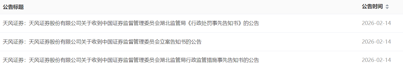 2月13日晚间,天风证券还公告称,公司于近期收到中国证监会下发的《立案告知书》,因公司涉嫌福建省永安林业(集团)股份有限公司持股变动信息披露违法违规,根据相关法律法规,决定对公司立案。目前公司经营情况正常。在立案调查期间,公司将积极配合中国证监会的相关调查工作,并严格按照有关法律法规及监管要求履行信息披露义务。