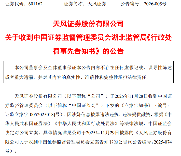 天风证券表示,公司诚恳接受处罚,并深刻反思,汲取教训,认真整改,坚持举一反三,依法合规稳慎推进公司各项业务,不断提高规范化运作水平。根据《行政处罚事先告知书》认定的情况,公司不触及《上海证券交易所股票上市规则(2025年4月修订)》规定的其他风险警示、重大违法强制退市情形。本次行政处罚最终结果以中国证监会湖北监管局出具的《行政处罚决定书》为准。公司将持续关注上述事项的进展情况,并严格按照有关法律法规的规定和要求,及时履行信息披露义务。目前公司经营情况正常。公司相关信息以公司在指定信息披露媒体刊登或发布的公告为准,敬请广大投资者理性投资,注意投资风险。