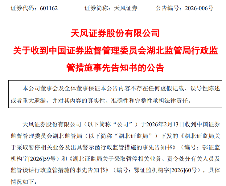 2月13日晚间,天风证券发布收到中国证监会湖北监管局行政监管措施事先告知书的公告。公司旗下私募子公司天风天睿投资有限公司因违规行为被采取暂停新设私募基金产品1年及出具警示函的行政监管措施;公司被采取暂停开展代销私募金融产品业务2年、责令处分有关责任人员并报告结果、监管谈话的行政监管措施。