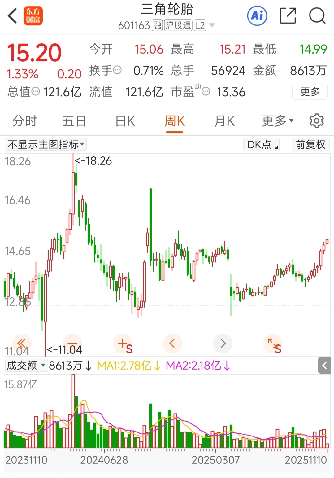 $三角轮胎(SH601163)$ 周线8连阳,蜗牛模式