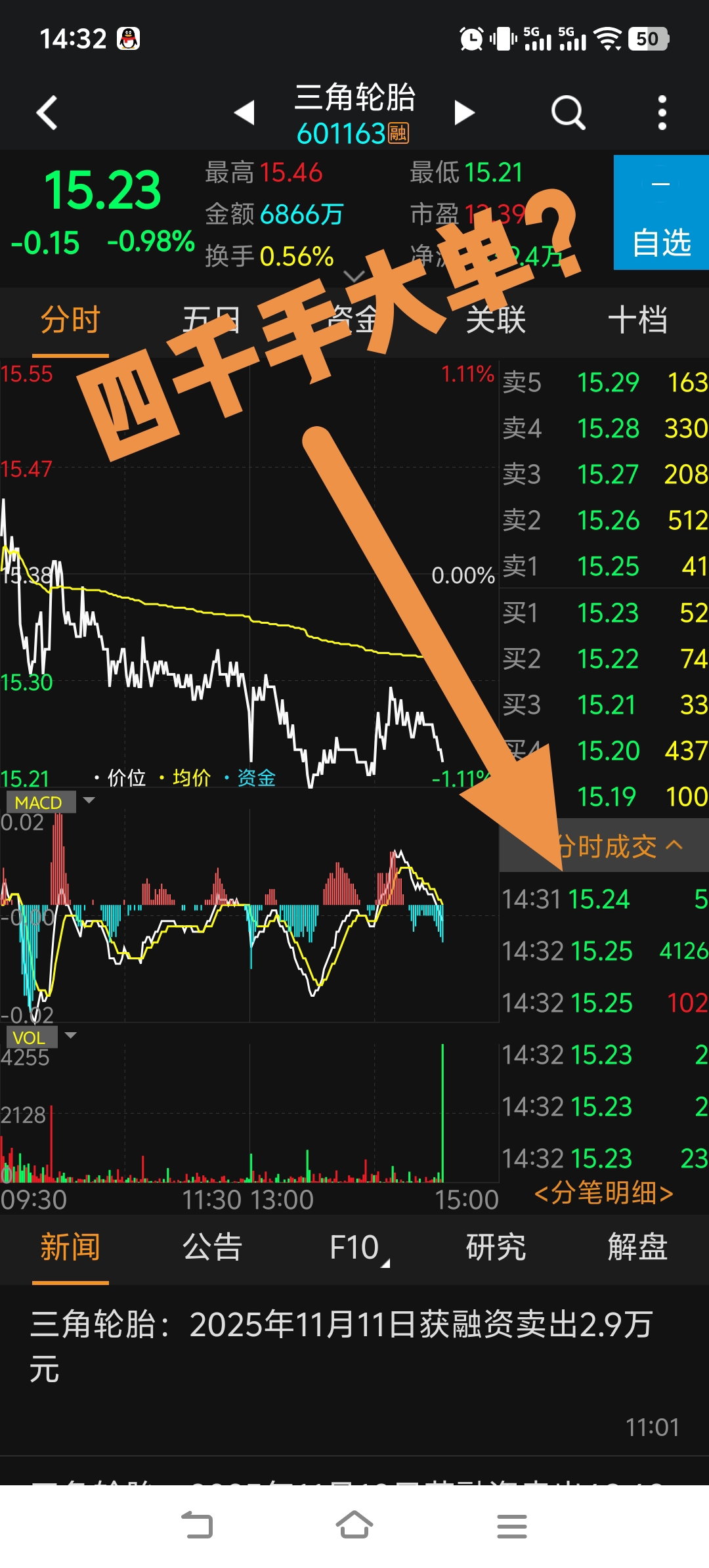 $三角轮胎(SH601163)$ 四千手大跑单???不小啊
