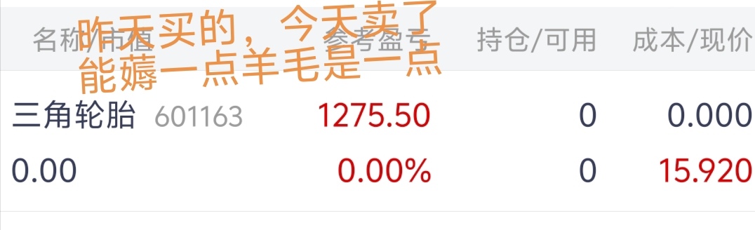 $三角轮胎(SH601163)$ 昨天买的,今天卖了,,,,,,能一点薅羊毛,算一点了!赚餐饭钱都好啊!