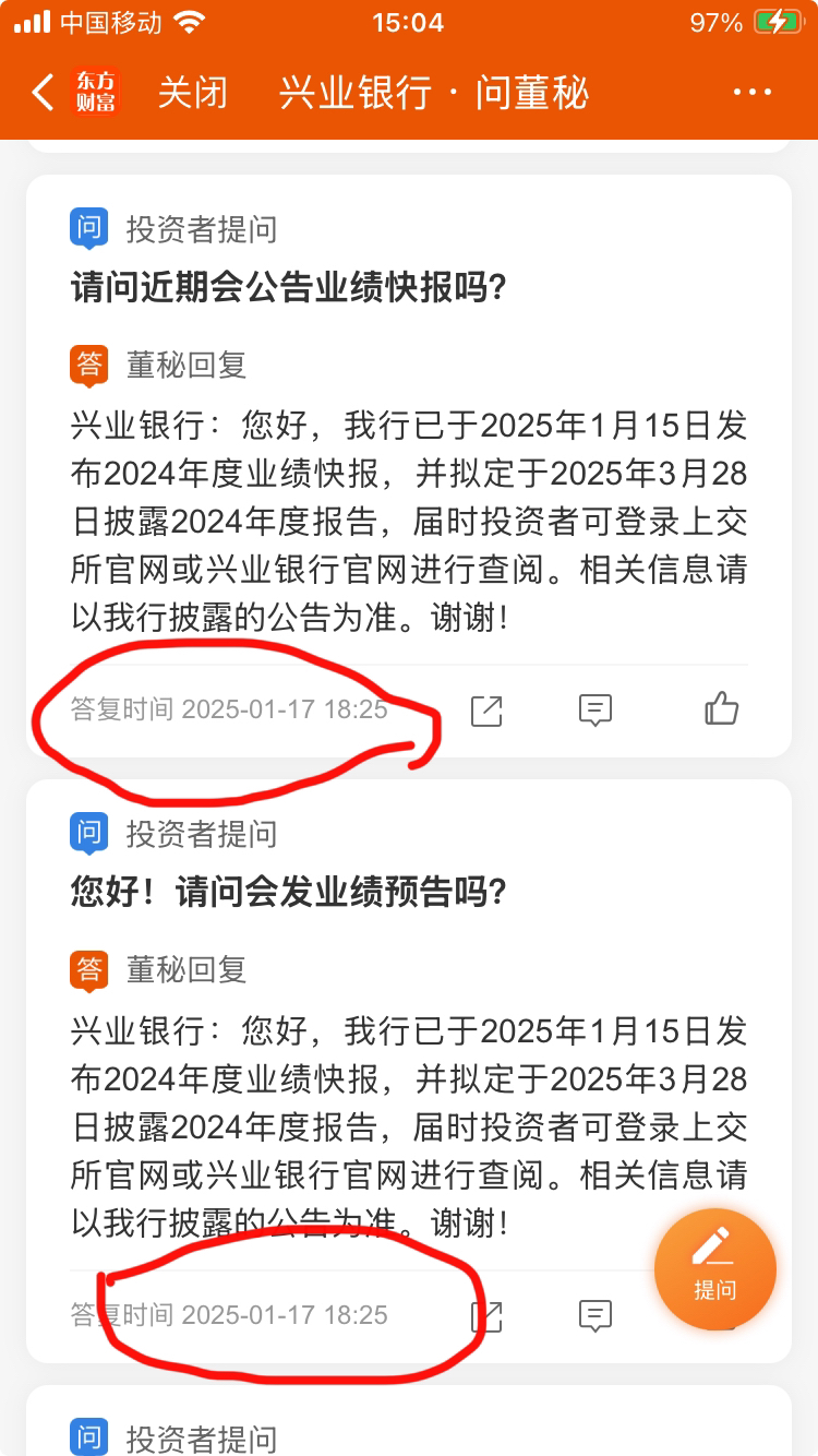 $兴业银行(SH601166)$ 今天仔细看了一下,兴业银行董秘发的回复,真是goupi不通,1.15发的快报,1.17发了回复说我们1.15发了快报。不知道是谁傻?不知道愚弄谁?这是有效沟通吗,股东们想知道什么,公司董事会又要表达什么?敷衍了事,太糊弄人了吧