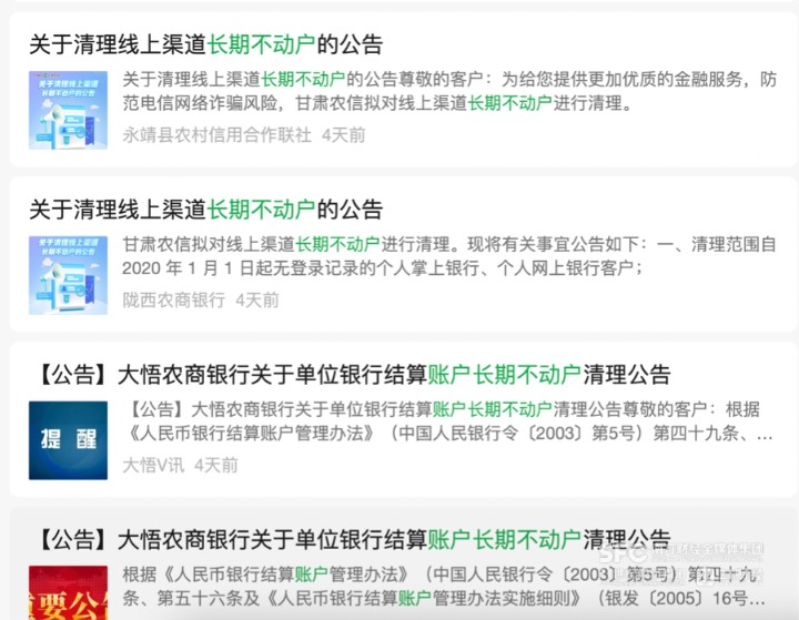 二是银行清理符合一定认定标准的长期不动户。如永靖县农村信用合作联社、陇西农商行、靖远农商银行对线上渠道长期不动户进行清理;酒泉农商银行、葫芦岛银行、界首农商银行、广州黄埔惠民村镇银行股份有限公司清理个人长期不动户;湖北大悟农村商业银行对单位银行结算账户长期不动户开展清理。