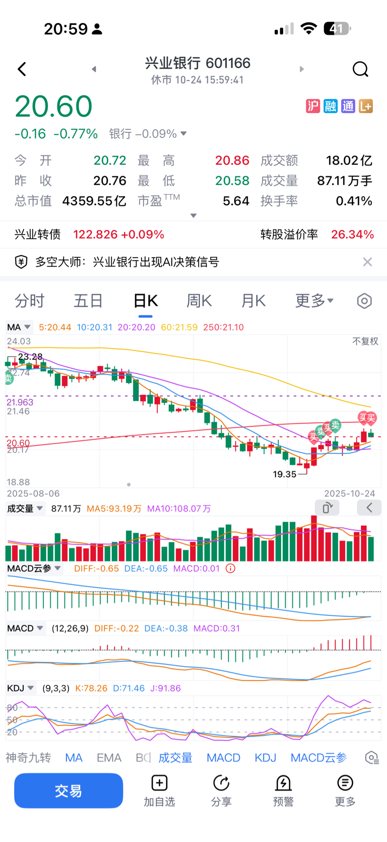 $兴业银行(SH601166)$ 继续加仓,底部均线粘合后向上发散.5上穿10.10上穿20.然后线上阴线就是买点.继续加仓.