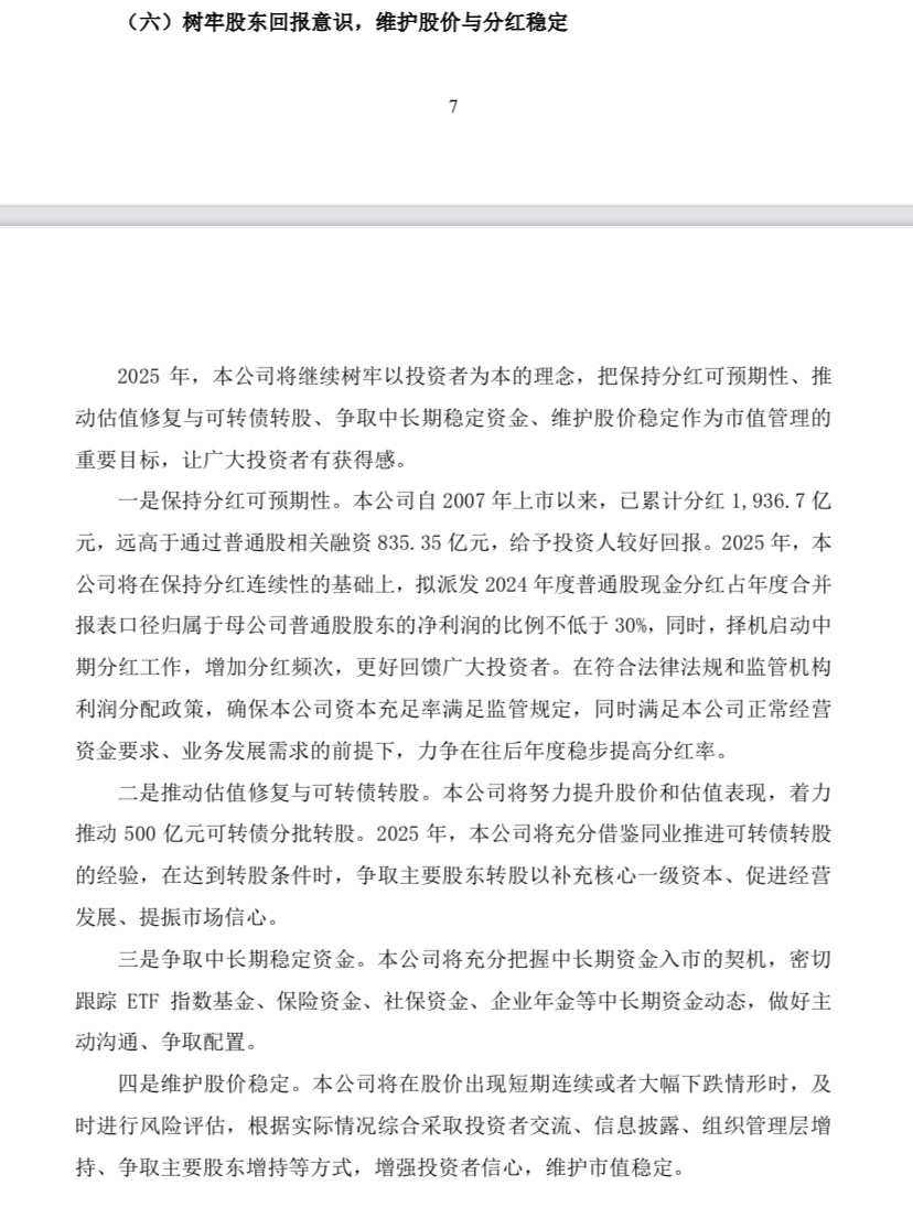 兴业银行表示,将努力提升股价和估值表现,着力推动 500 亿元可转债分批转股。2025年,兴业银行将充分借鉴同业推进可转债转股的经验,在达到转股条件时,争取主要股东转股以补充核心一级资本、促进经营发展、提振市场信心。