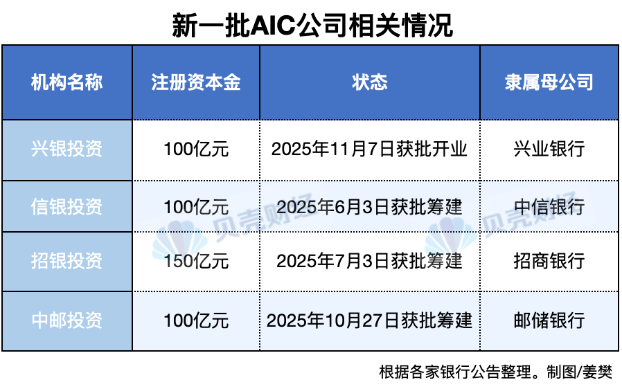 今年5月份,国家金融监督管理总局局长李云泽在国新办发布会上明确表示,支持符合条件的全国性商业银行设立金融资产投资公司。政策信号释放后,兴业银行于当日率先获批筹建兴银投资,成为首家获得AIC牌照的股份制银行。