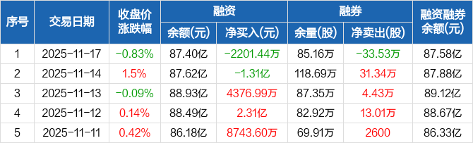 兴业银行:融资净偿还2201.44万元,融资余额87.4亿元(11-17)