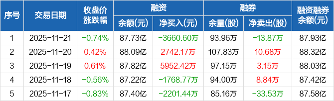 兴业银行:融资净偿还3660.6万元,融资余额87.73亿元(11-21)