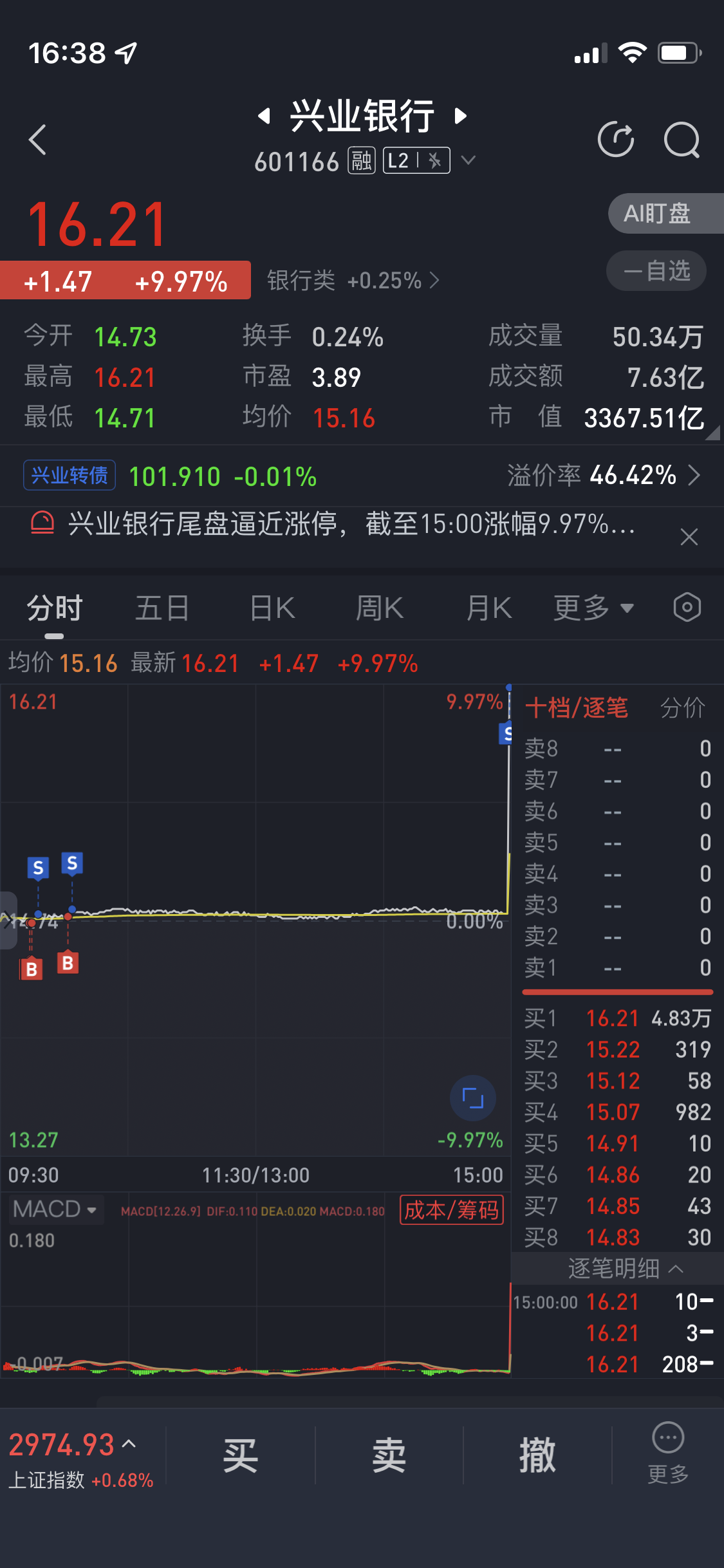 羡慕在车上的股友们,兴业是个好票值得长线投资,虽然卖在了涨停可错失了N个涨停!