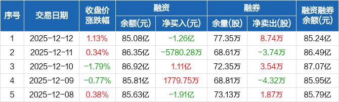 兴业银行:融资净偿还1.26亿元,融资余额85.08亿元(12-12)