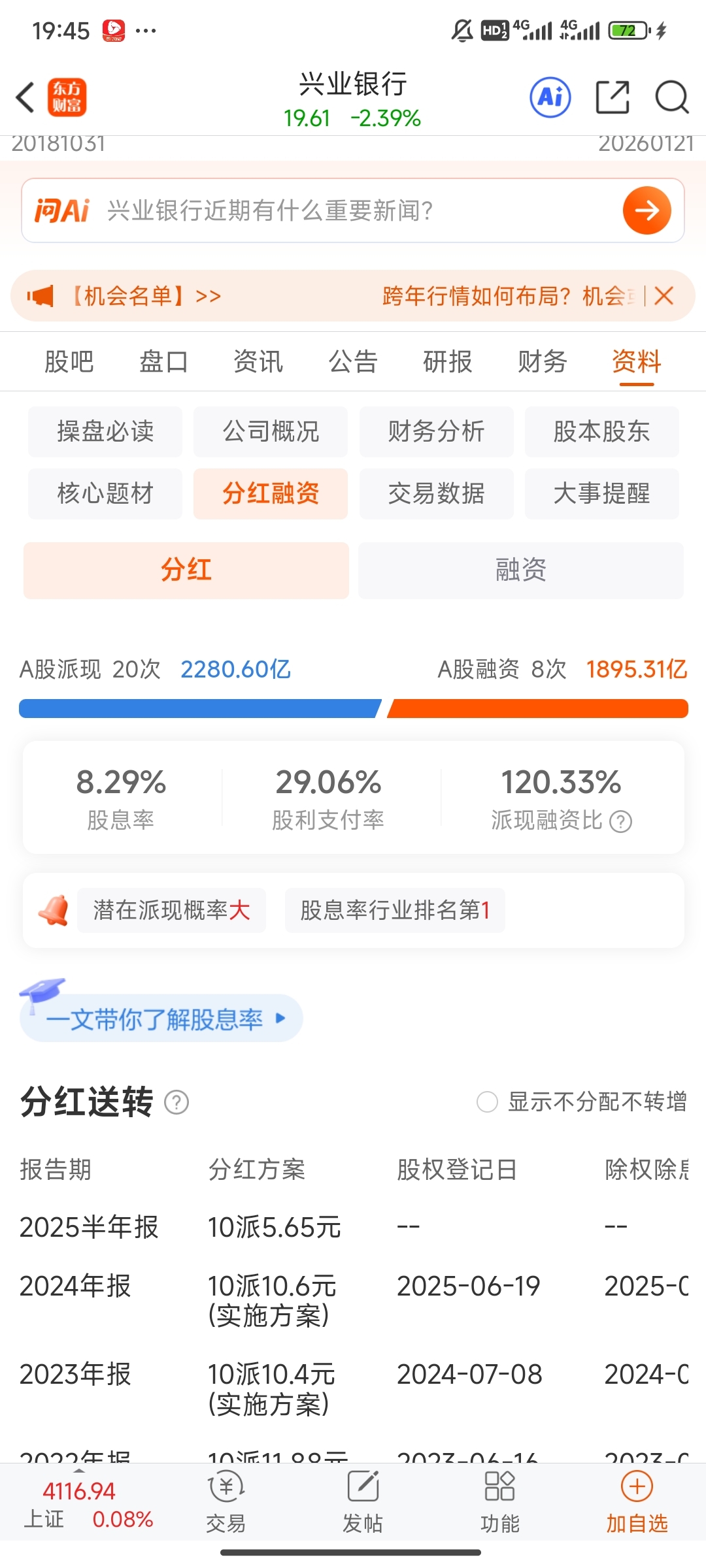 $兴业银行(SH601166)$ 上市20年,分红减融资,20年就分200亿