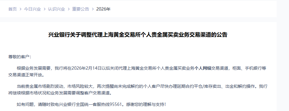 近日,兴业银行官网发布公告称,根据业务发展需要,该行将在2026年2月14日以后关闭代理上海黄金交易所(以下简称上金所)个人贵金属买卖业务个人网银交易渠道,柜面、手机银行等交易渠道正常开放。这也是近期又一家银行对个人贵金属买卖业务进行调整。