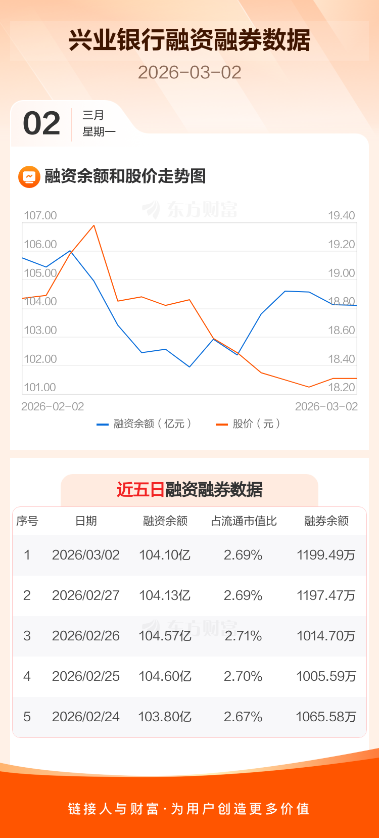 交易所最新数据显示,兴业银行于2026年3月2日获融资买入1.61亿元,融资偿还1.65亿元,当日融资净偿还385.95万元。目前,该股融资余额104.10亿,占流通市值比例为2.69%。