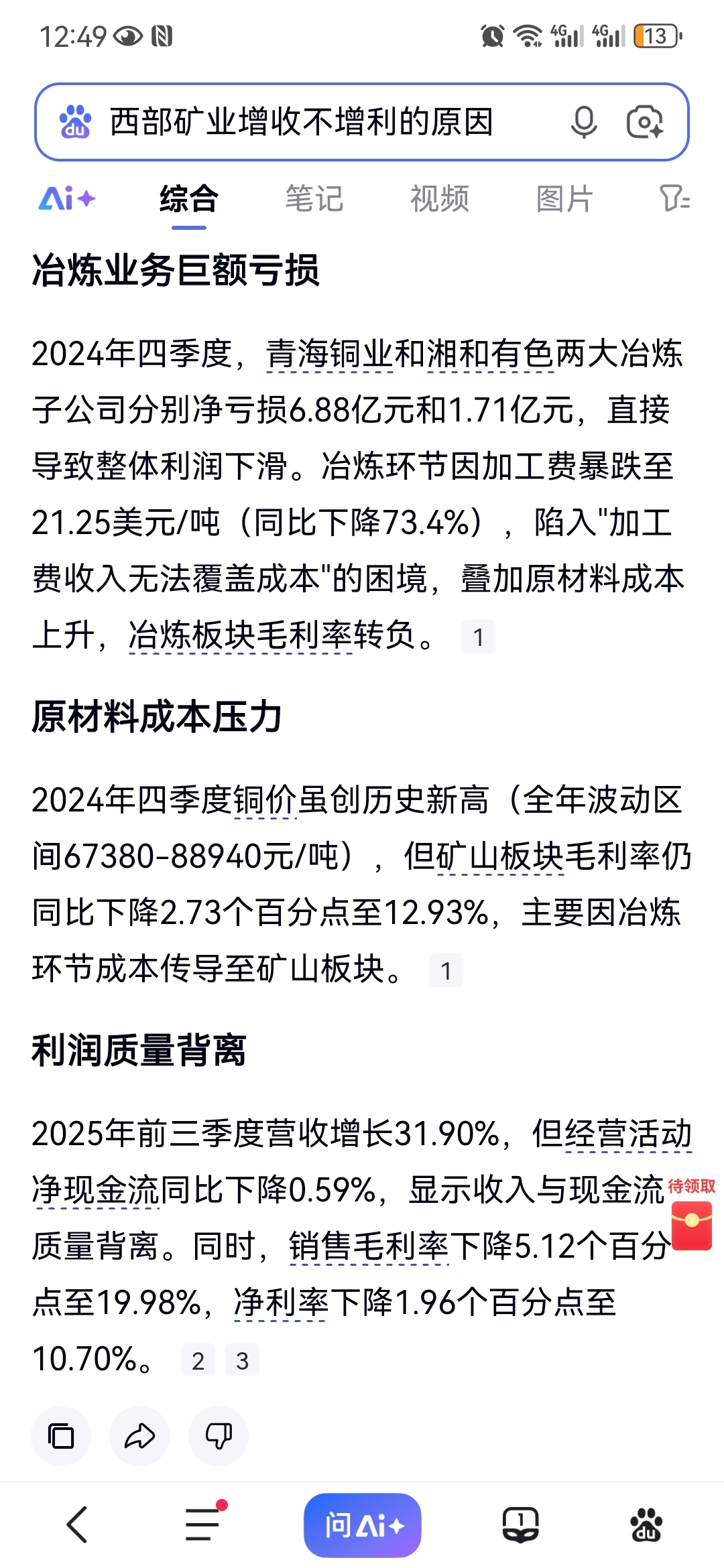 $西部矿业(SH601168)$ 冶炼业务巨额亏损,导致增收不增利。