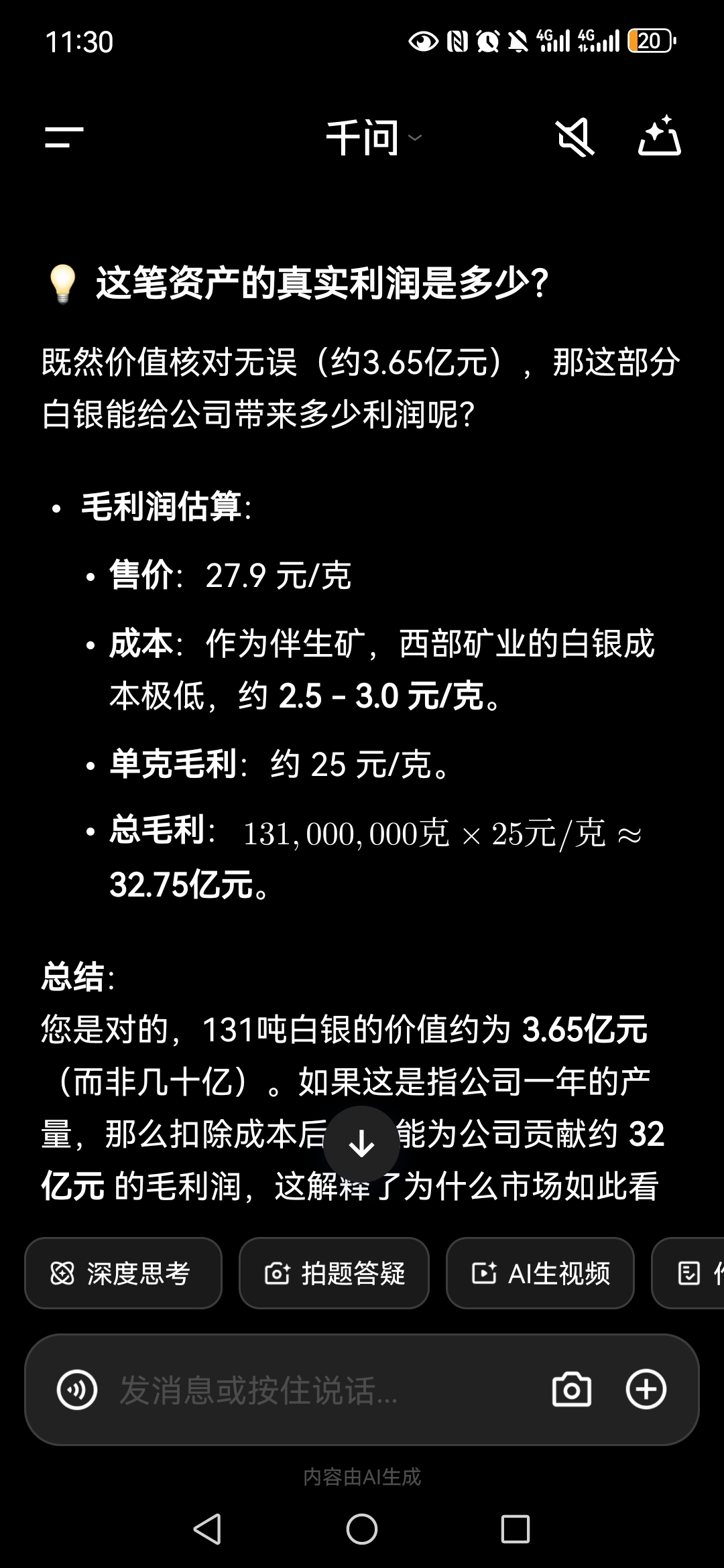 $西部矿业(SH601168)$ 131吨白银的它能为公司贡献约 32亿元 的毛利润(成本约2.5元每克),这解释了为什么市场如此看好西部矿业的白银业务——量大且成本极低
