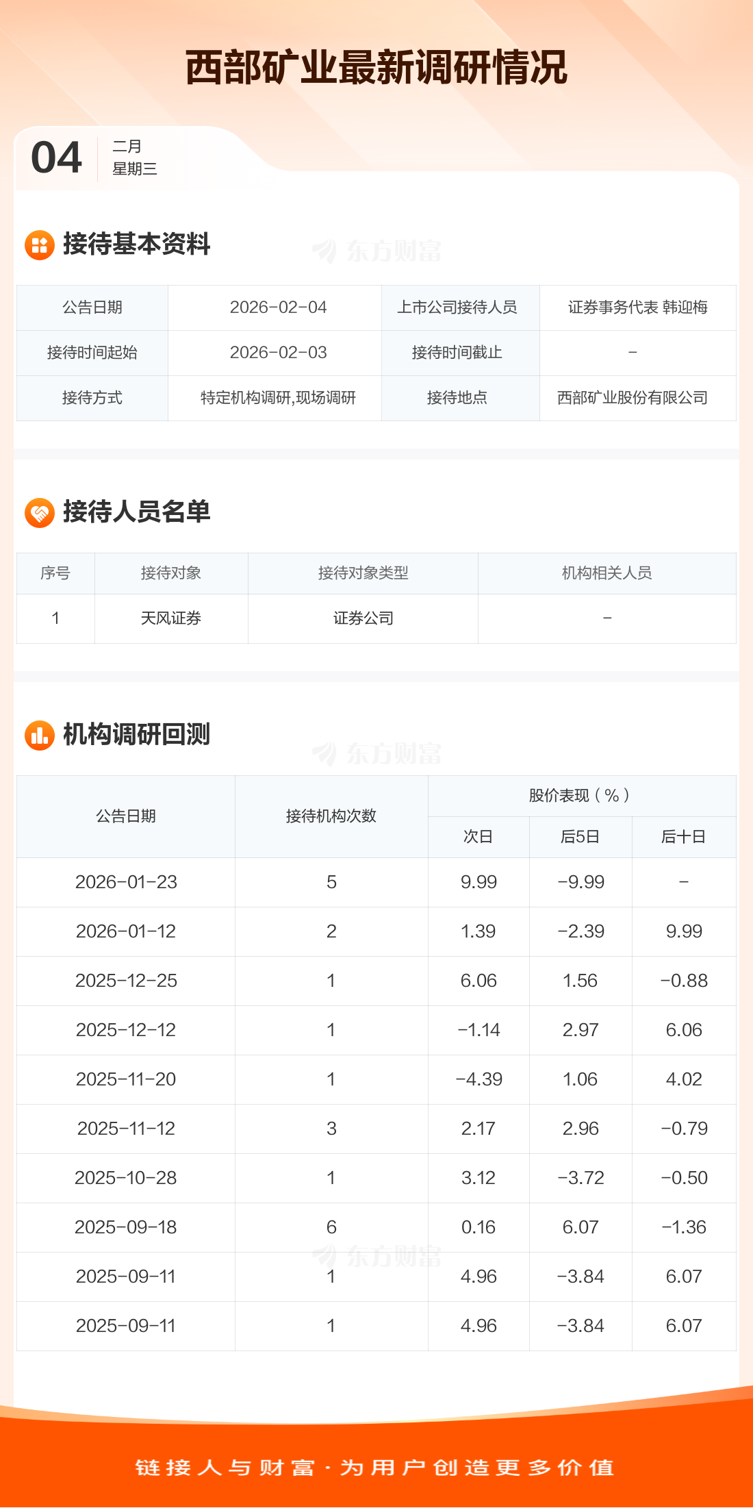 西部矿业2月4日公告称,2月3日接待天风证券等1家机构调研。接待人员包括证券事务代表 韩迎梅。