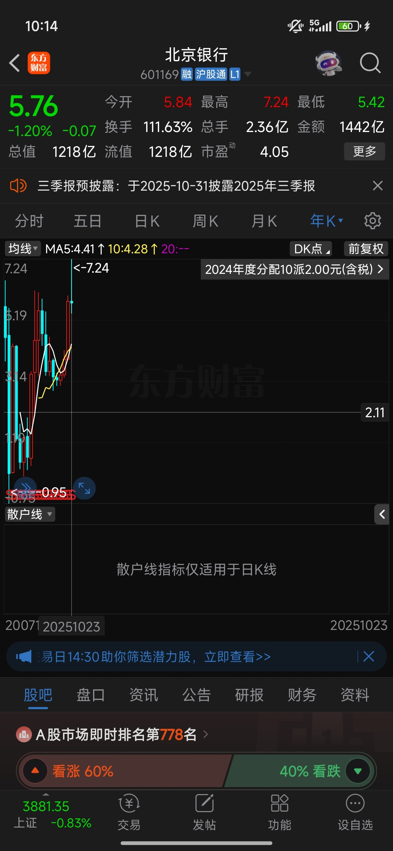 城商行老大?今年涨幅城商行倒数第一,年线还是绿的,而银行板块年线涨幅12%。