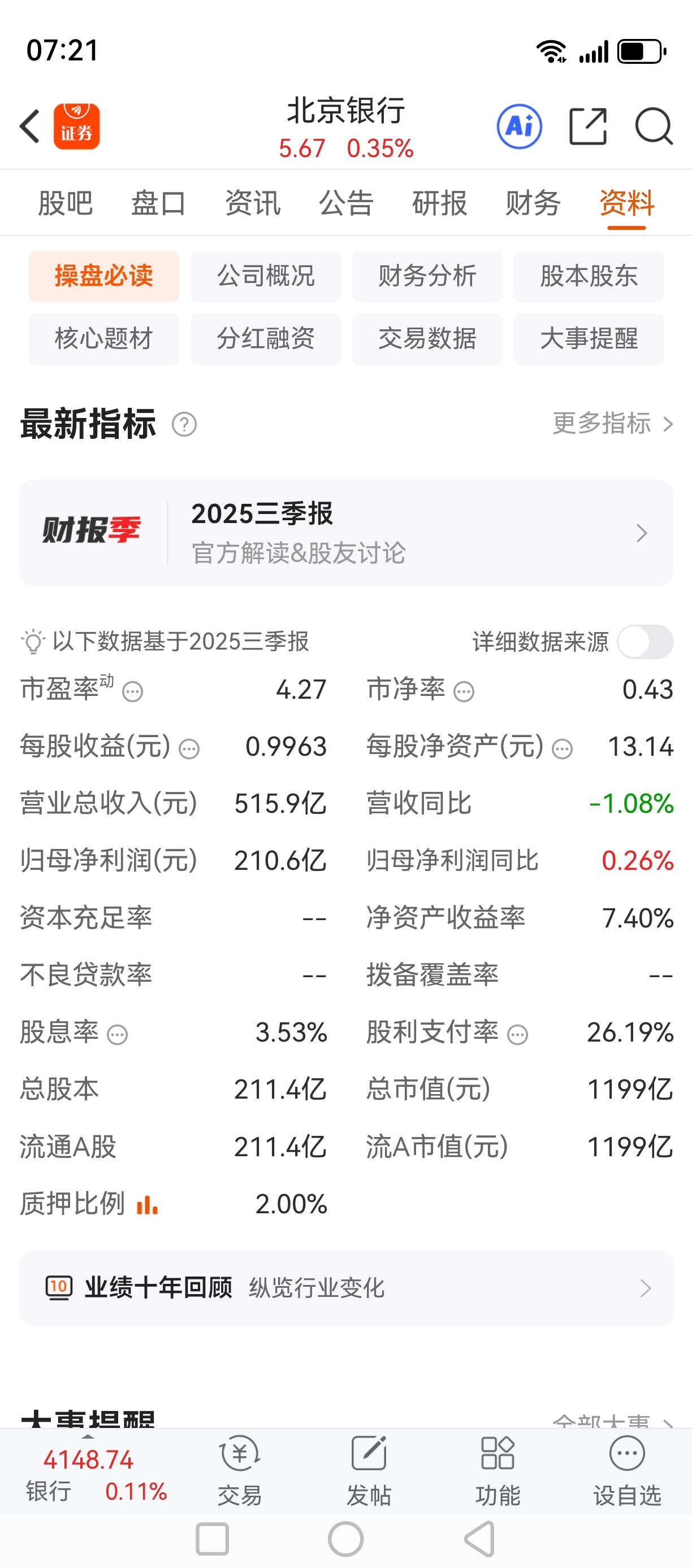 $北京银行(SH601169)$ 为什么我这看到的是0.9963