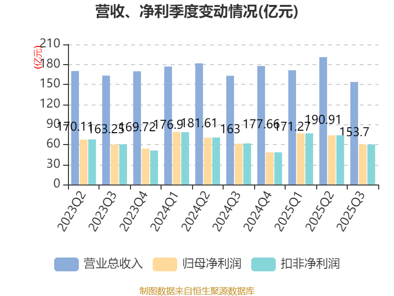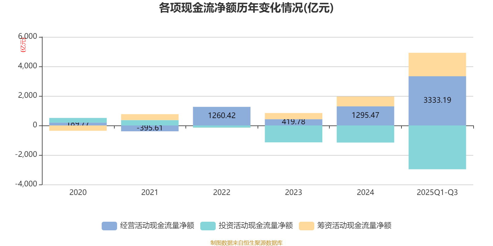 2025年前三季度,公司经营活动现金流净额为3333.19亿元,同比增长354.99%;筹资活动现金流净额1589.66亿元,同比增加1400.24亿元;投资活动现金流净额-2968.31亿元,上年同期为-422.93亿元。