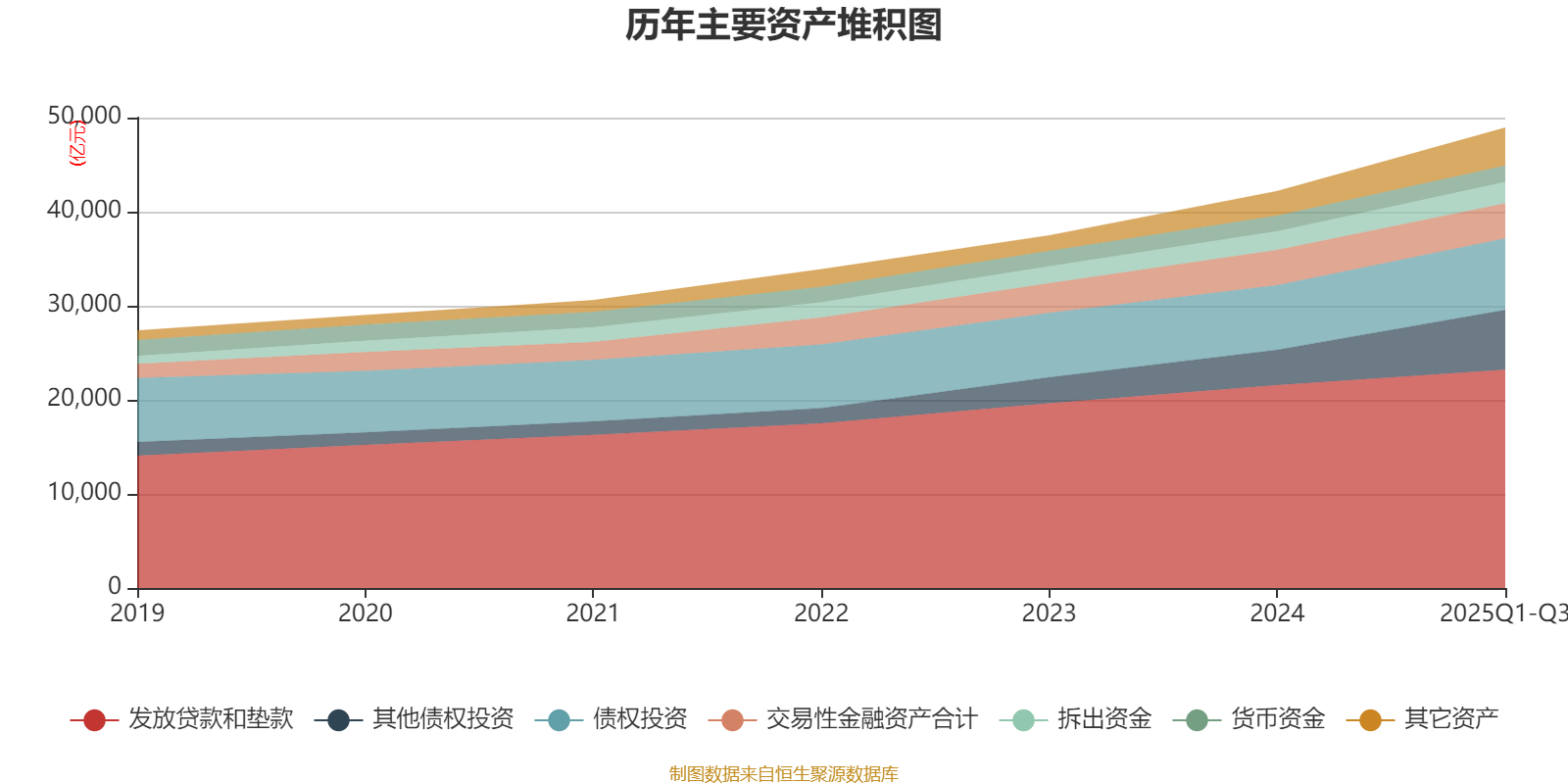 资产重大变化方面,截至2025年三季度末,公司其他债权投资较上年末增加69.75%,占公司总资产比重上升4.12个百分点;发放贷款和垫款较上年末增加7.53%,占公司总资产比重下降3.71个百分点;存放同业款项较上年末增加673.47%,占公司总资产比重上升2.18个百分点;交易性金融资产合计较上年末减少0.47%,占公司总资产比重下降1.26个百分点。