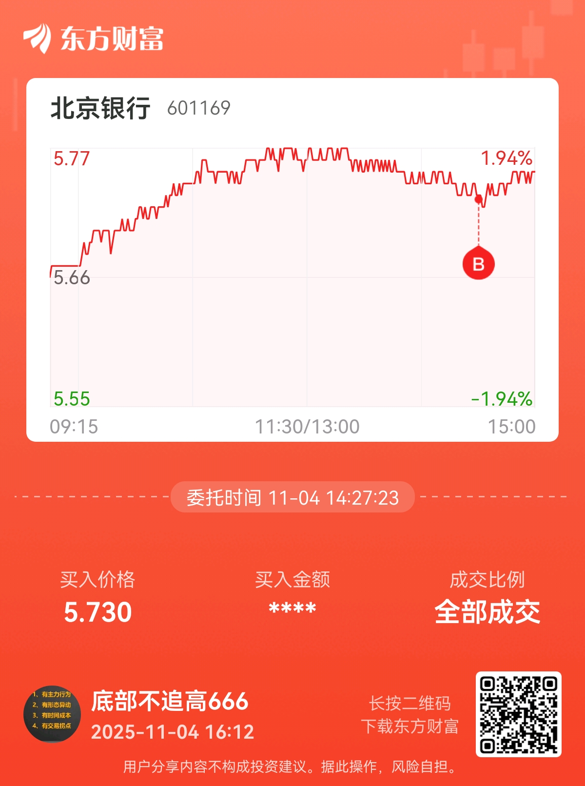 委托标的:北京银行601169买卖方向:买入笔记:5.73