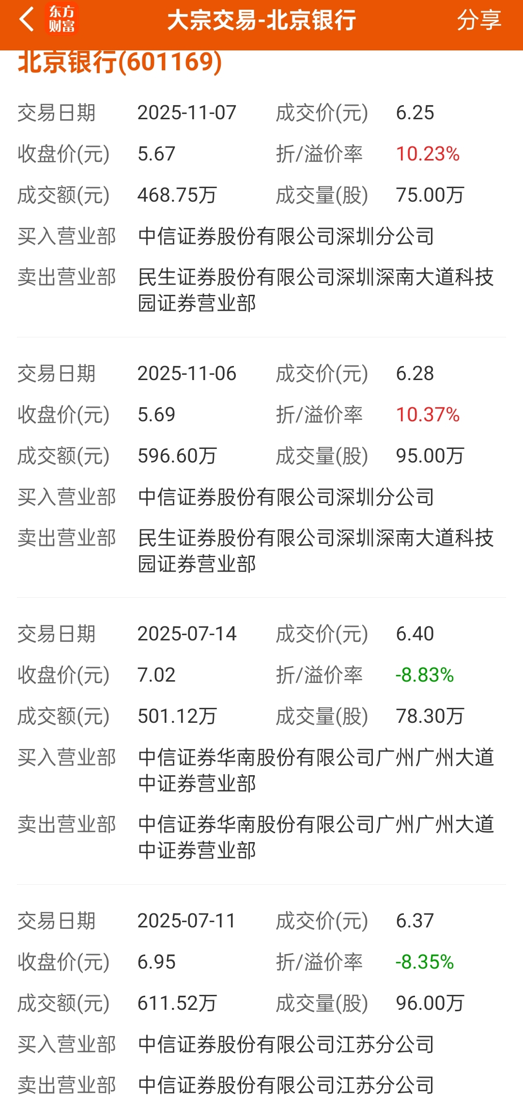 $北京银行(SH601169)$ 这大宗交易啥意思,发信号要拉?7月份跌之前折价,现在溢价,表现确实太拉胯了