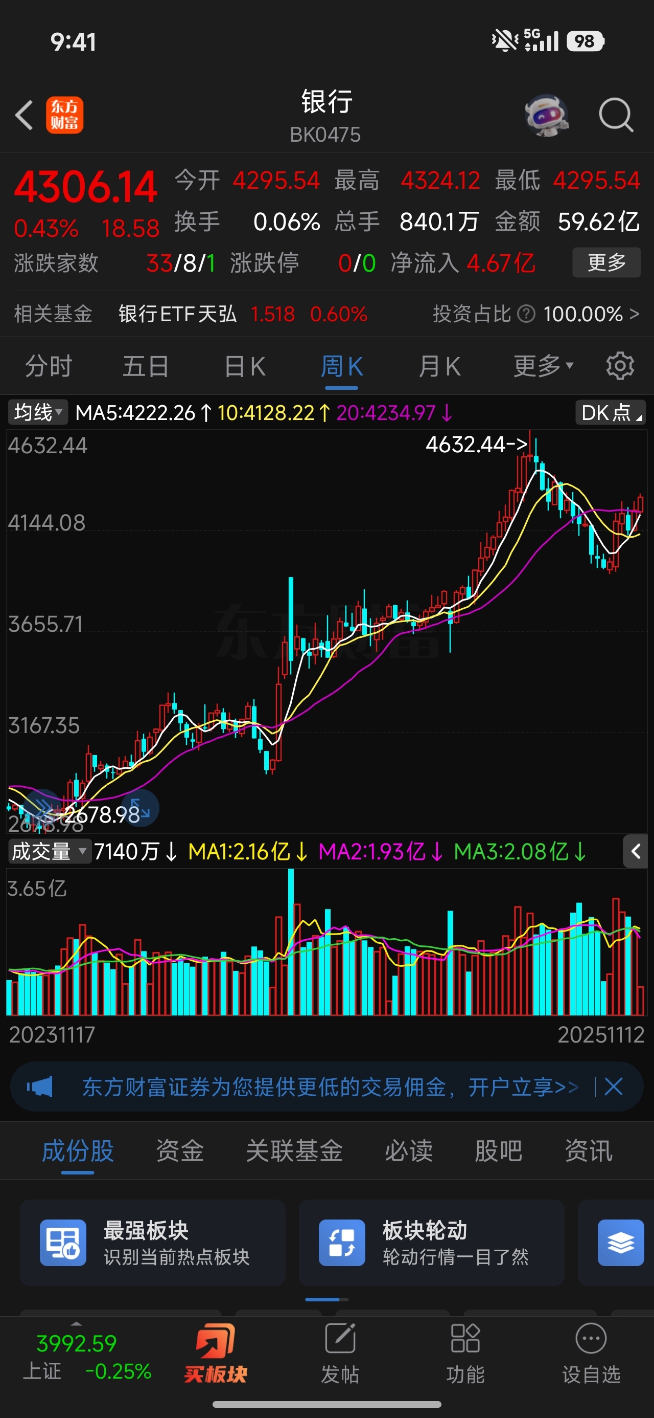 从周线上来看,二周前,银行板块跌1.9%,这两周涨5%,已把跌的涨双倍回去了,北