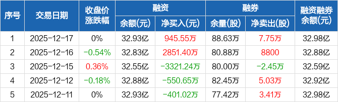 北京银行融资融券信息显示,2025年12月17日融资净买入945.55万元;融资余额32.93亿元,较前一日增加0.29%。