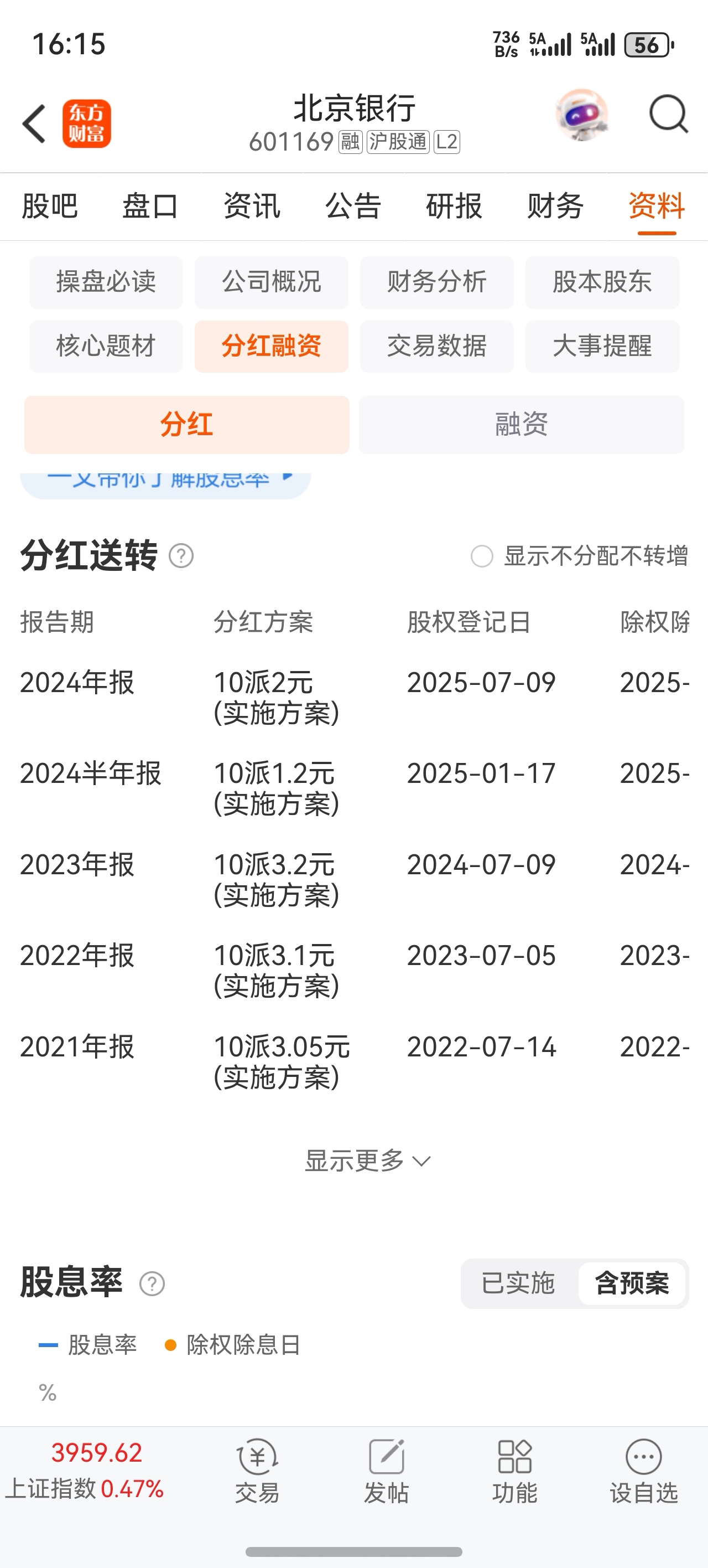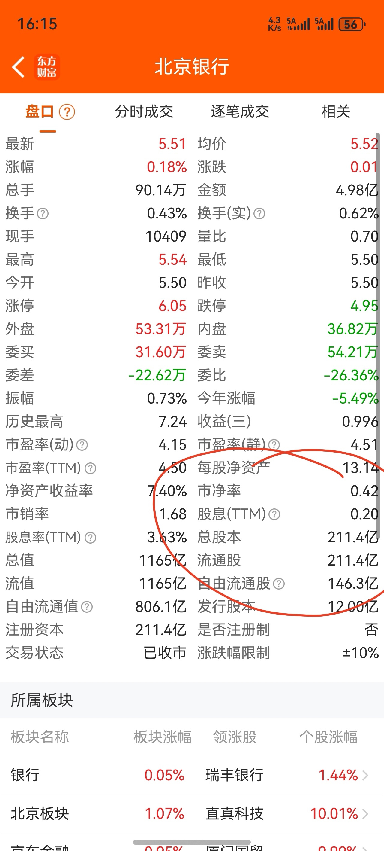 $北京银行(SH601169)$ 这货明目张胆的财务造假,实际股息率按照今天收盘价应该是5.8%,而他主页面里才给0.20TTM的股息率,换算过来0.02÷5.51 =3.6%的股息率,大家打证监会电话举报他!
