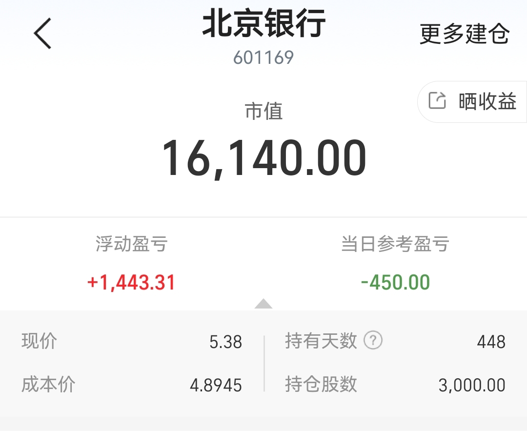 $北京银行(SH601169)$ 快到成本区了