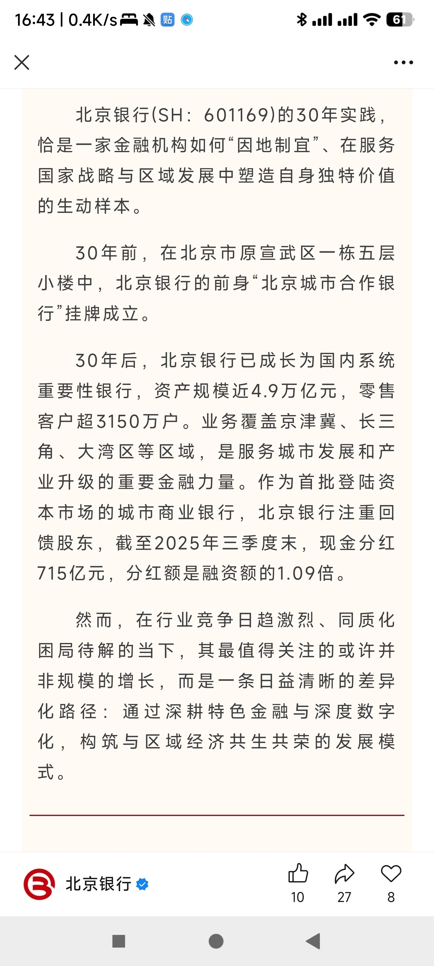 $北京银行(SH601169)$ 笑死人了,注重回馈股东,这么多年了每股净资产0.6都没摸到过,公司账上这么多现金也不提高一下分红,核心一级资本充足率可以发永续债来弥补啊。