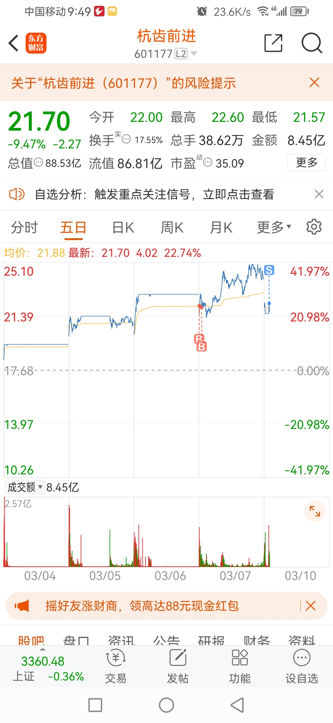$杭齿前进(SH601177)$ 微红走了,涨了就tm发监管,恶心人