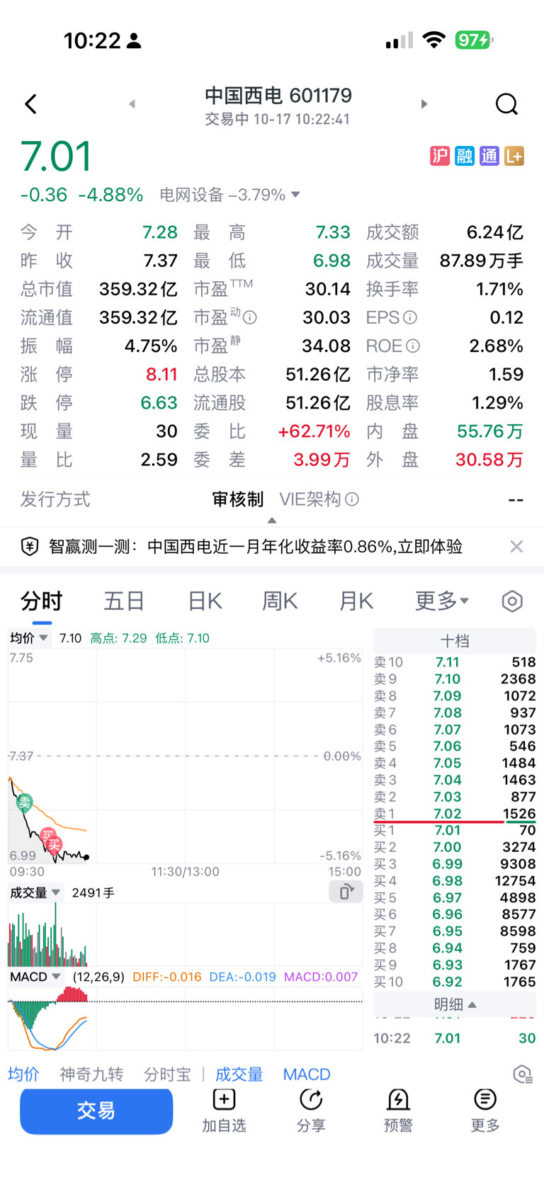 $中国西电(SH601179)$ 挂单7.16抢跑,结果就跑了8手票.那么不跑啦,接回来,再增持200手.敢跌停再增持100手.这样仓位5分之3仓位了.然后往下了再补.