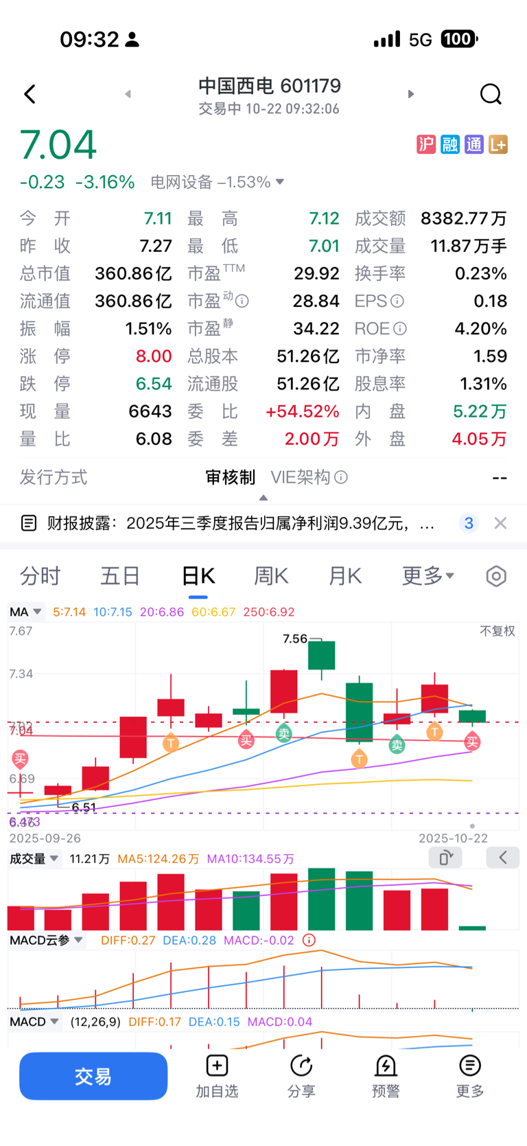 $中国西电(SH601179)$ 一来一回5400.除200.少亏5000.昨天的300手继续增持